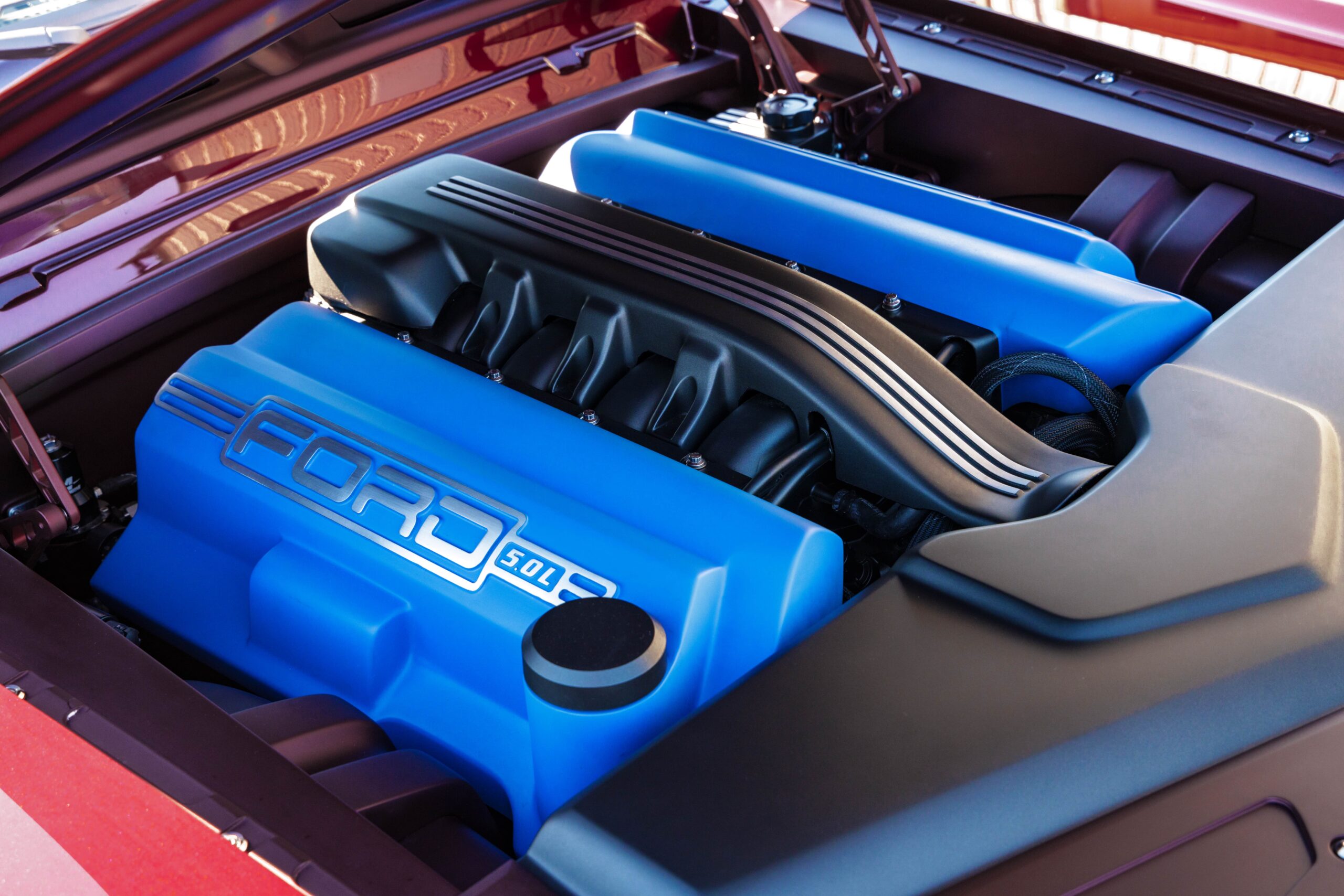 The exterior boasts a BASF Glasurit "Burgundy Brave" finish, and all the chrome and stainless-steel trim has been treated with Cerakote Titanium C-105P. A redesigned front grille, recessed by two inches, feeds air to a Ford Performance 5.0-liter Coyote V8 crate engine, producing 460 horsepower at 7,000 RPM and 420 ft-lbs of torque at 4,600 RPM. The power is channeled through Ford's 10R80 10-speed automatic transmission.