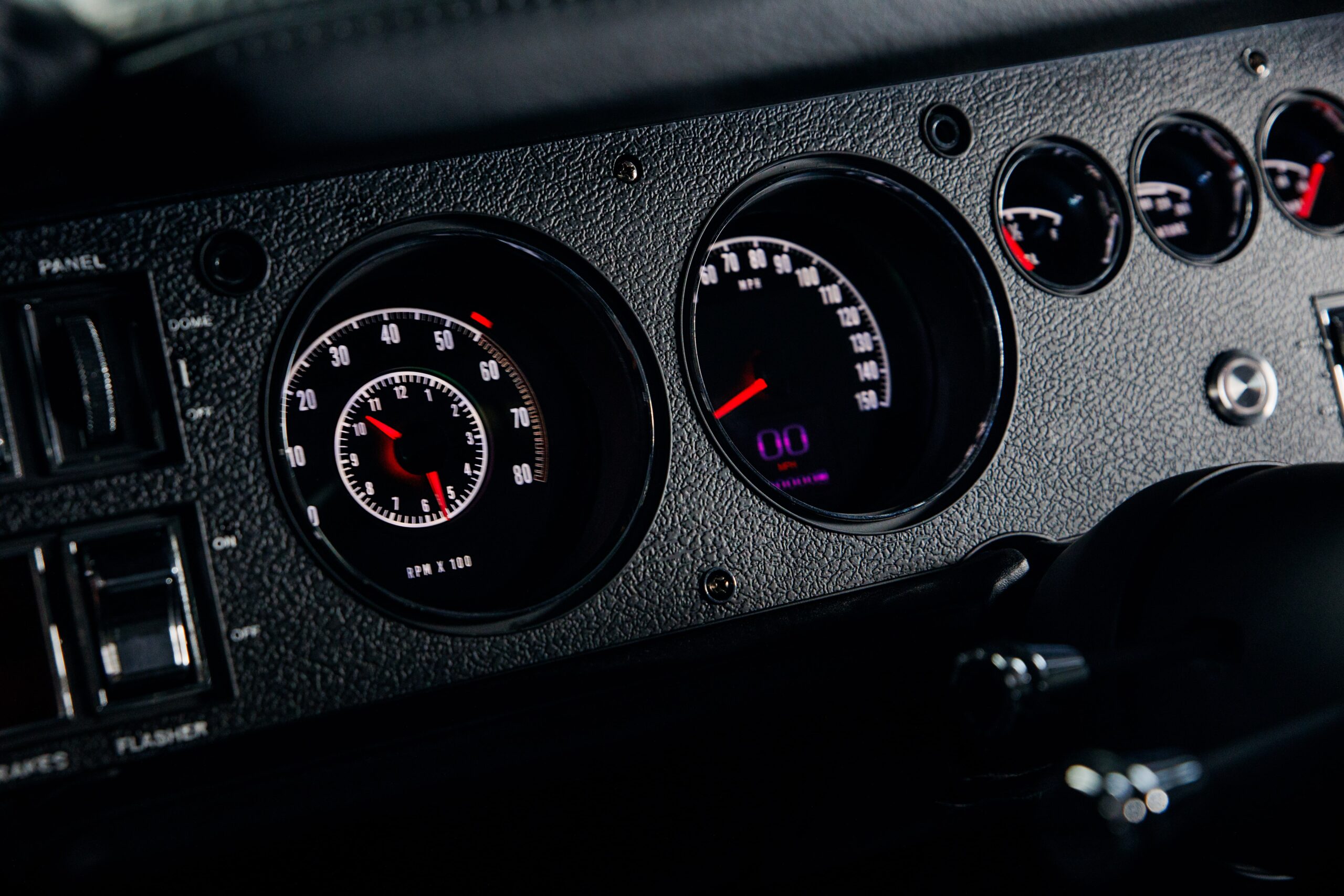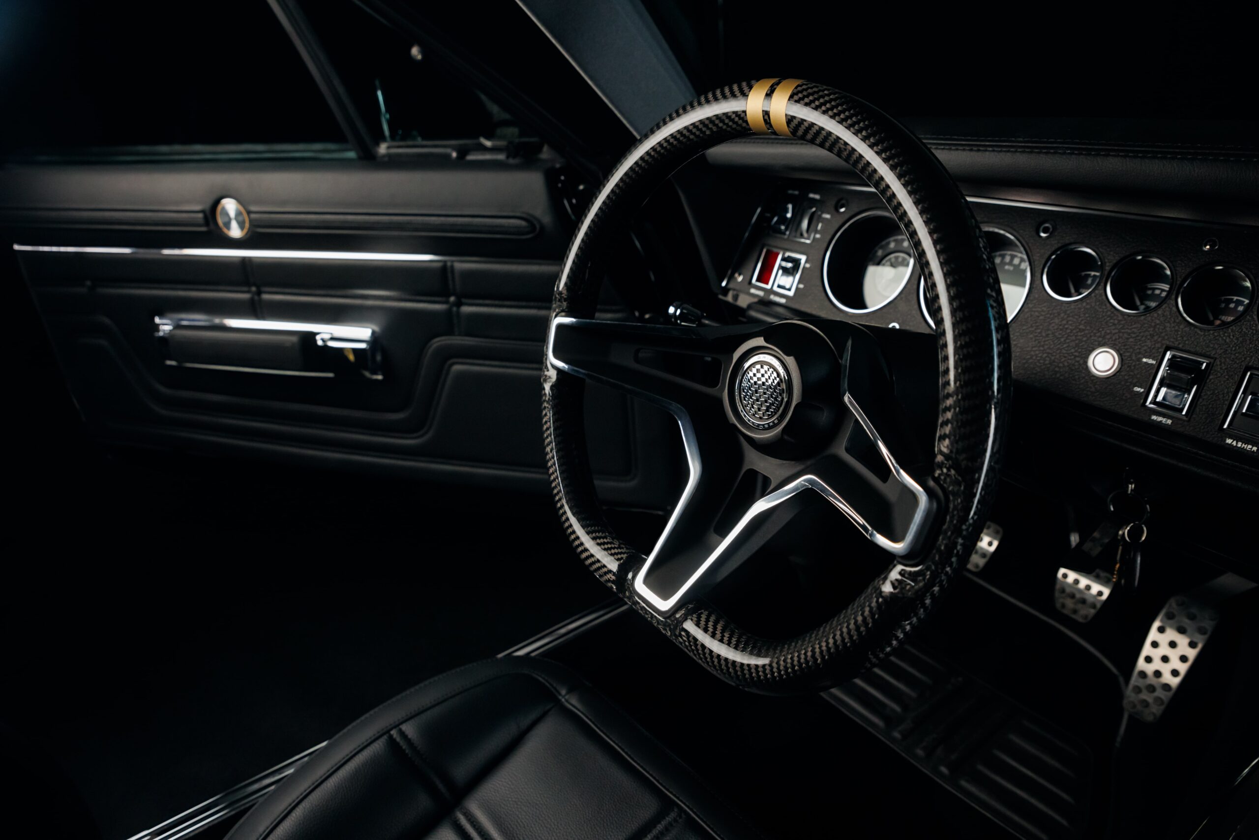 The same level of precision extends to the interior, where modern comforts and conveniences are seamlessly integrated. A custom leather interior with a carbon-fiber console takes center stage, complete with a custom carbon-fiber "pistol grip" shifter, paying homage to Mopar's heritage. Upholstery Unlimited crafted the bespoke interior, which also includes a Gentex rearview mirror, Dakota Digital gauges, and a Vintage Air Gen IV climate-control system.