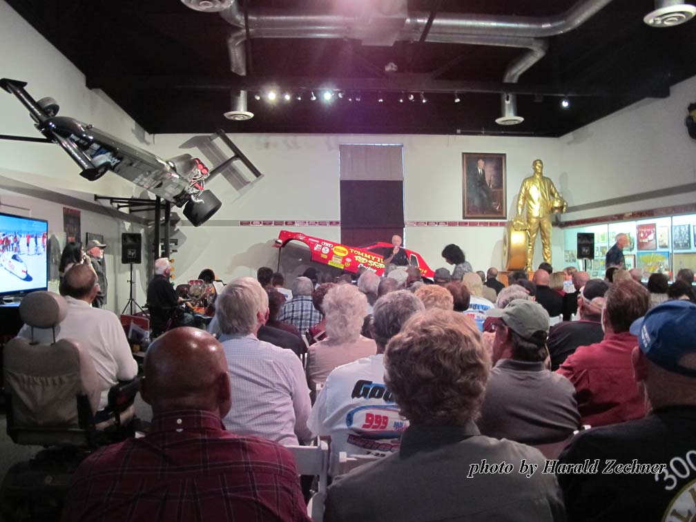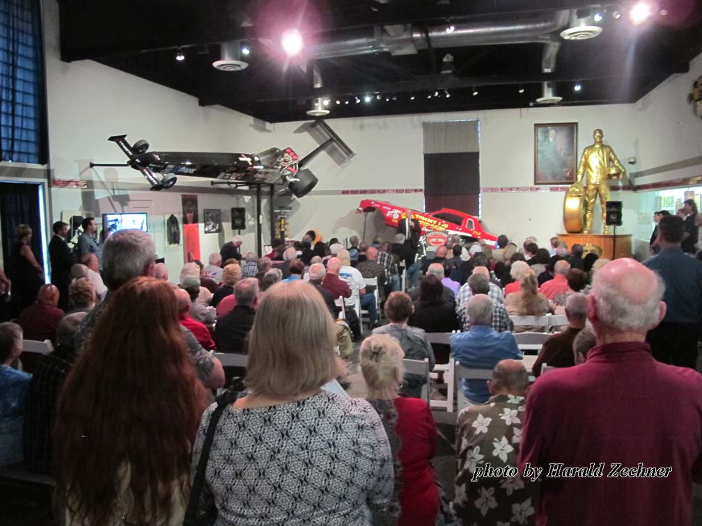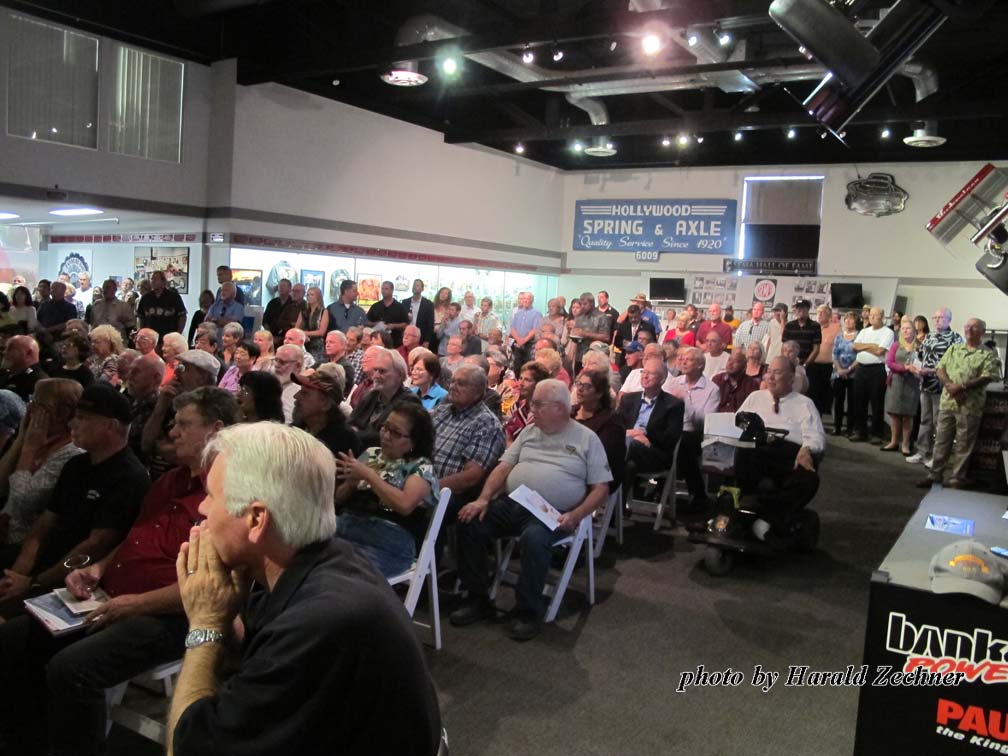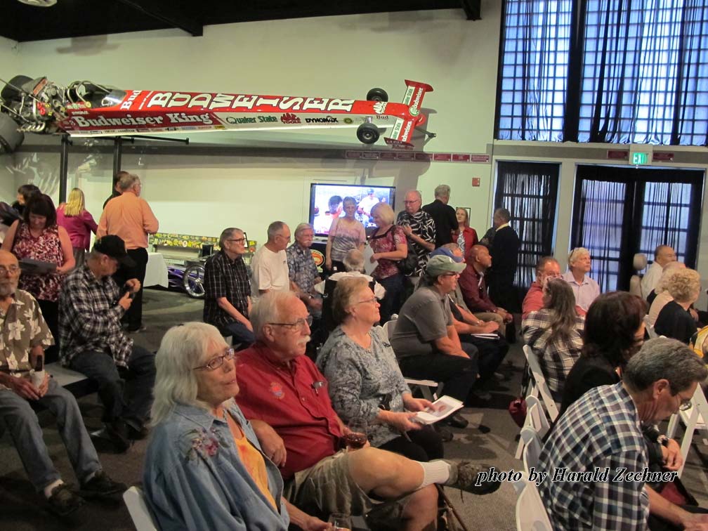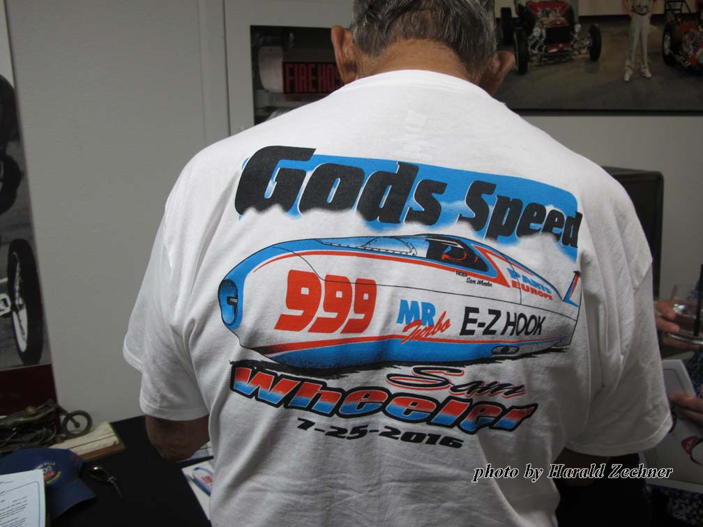 Held at the National Hot Rod Association Museum in Pomona California on Oct. 17, 2016, the event was well planned out. It took place just a short walk from the entrance, past a room full of Hot Rods and Dragsters along with signs, jackets, helmets, trophies and more. Two full bars greeted arrivals at the “Hall of Champions” entrance. Giant Sam Wheeler pictures lined one side of the Hall entrance. Everyone was encouraged to grab a Sharpie and leave their marks on the pictures; most did. Sam Wheeler Memorial pamphlets, posters, decals, DVDs, and full-color eight page-booklets that included pictures and a wonderful story by Dick Lague filled tables on the other side of the Hall entrance.