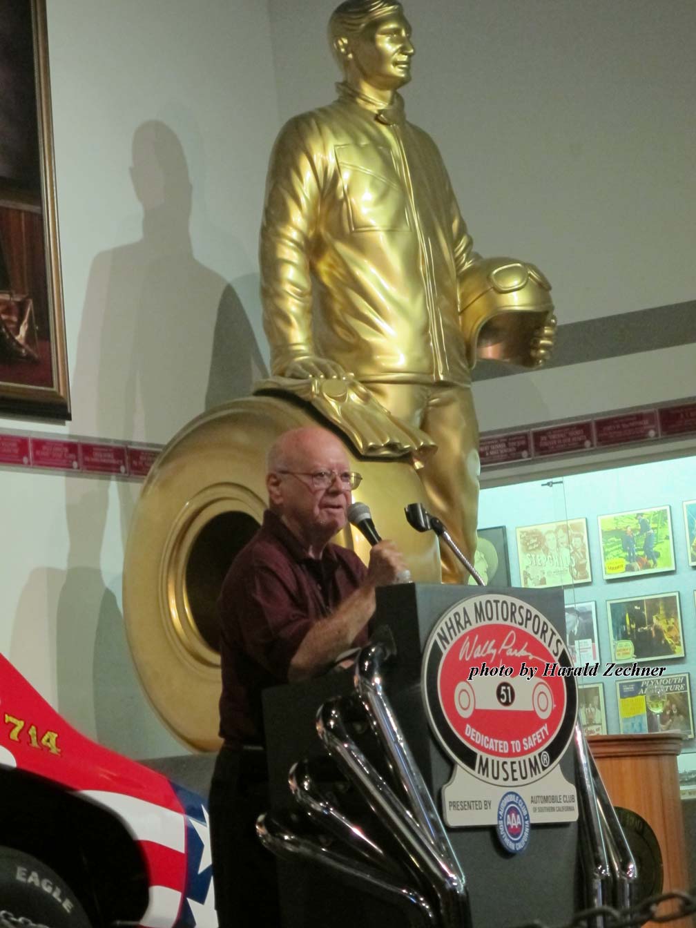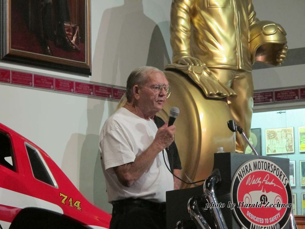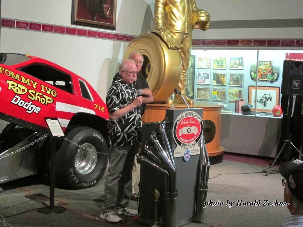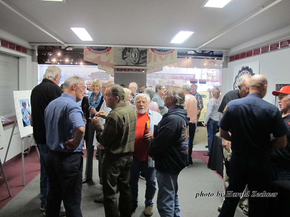Held at the National Hot Rod Association Museum in Pomona California on Oct. 17, 2016, the event was well planned out. It took place just a short walk from the entrance, past a room full of Hot Rods and Dragsters along with signs, jackets, helmets, trophies and more. Two full bars greeted arrivals at the “Hall of Champions” entrance. Giant Sam Wheeler pictures lined one side of the Hall entrance. Everyone was encouraged to grab a Sharpie and leave their marks on the pictures; most did. Sam Wheeler Memorial pamphlets, posters, decals, DVDs, and full-color eight page-booklets that included pictures and a wonderful story by Dick Lague filled tables on the other side of the Hall entrance.