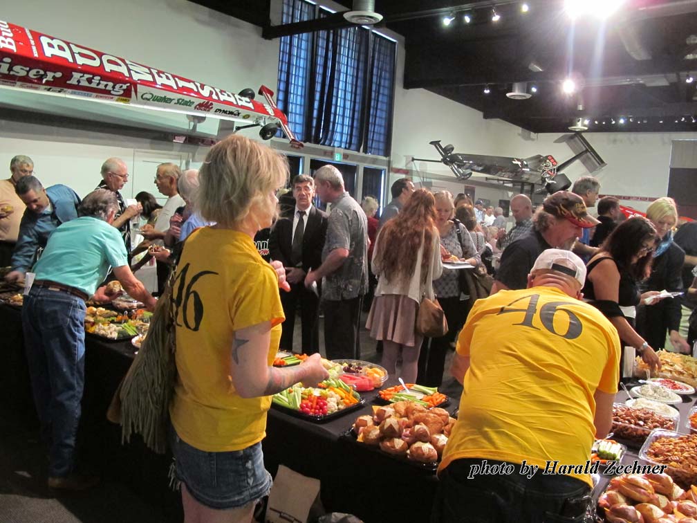 In the “Hall of Champions,” a well-edited Sam Wheeler photomontage played on two giant monitors. In the back of the room multiple tables were filled with food - lots and lots of food. On the other end stood a NHRA podium and seating for probably 100 or so. There were lots of people. Many wore shirts honoring Sam Wheeler, the SCTA, and 200 or 300 MPH Club, and mingled together, talking, eating, and enjoying a drink or three. The mood was light and joyful. Everyone had a story or five.