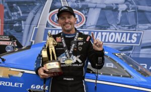 Nearly everything changed on Sunday as it normally seems to do in drag racing. After four rounds of eliminations, eight-time Top Fuel champion Tony Schumacher held his 88th Wally winner’s trophy aloft, a boost as he contemplates a ninth series title. In the final round, racing four-time champ Steve Torrence, Schumacher recovered from a leisurely reaction time of .071 to post a 3.718 second pass at 329.42 mph, while Torrence’s .036-sec RT resulted in .0107 of a second loss at 3.763/316.90. Earning his second win of the year, Schumacher moved from ninth to sixth in the standings.