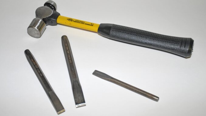 When working with punches and chisels, do not use examples with mushroomed heads. When using a punch or chisel, never point the tool toward your body. Instead, point the work (forces) away from your body. When handing a sharp tool such as a chisel to another person, direct sharp points and cutting edges away from yourself and the other person.
