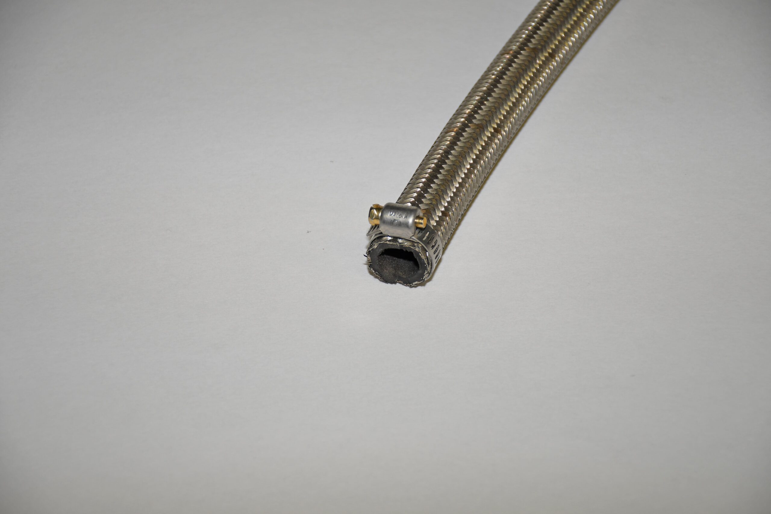 When working on braided hose, you’ll often find the end of the wire braid can become frayed. If that happens it becomes a real chore (and a lot of accompanying physical pain) to fit the frayed ends inside the fitting. The fix is to add a small hose clamp over the frayed end. Tighten the clamp and the wire braid will shrink sufficiently to fit itothe hose end. Once you get the hose end started, remove the clamp and continue with the assembly process. This tip regularly saves on Band Aids!
