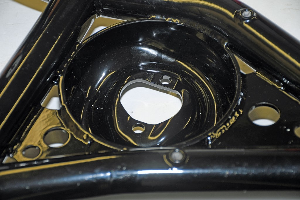 This lower a-arm is from Detroit Speed. In order to fit the shock adjuster in the a-arm, the opening has been enlarged. As noted in the text, we test fit the shock in the pocket without the spring and ran the suspension through its travel to ensure the shock adjuster does not make contact with the a-arm.