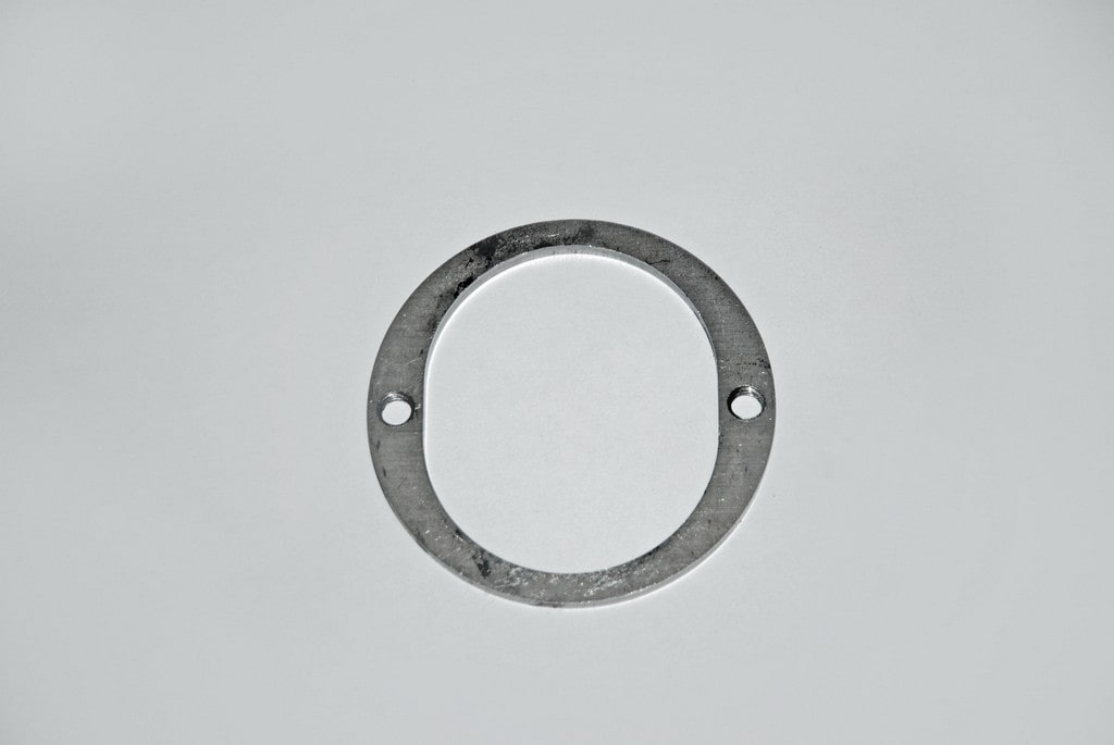 For a stock lower a-arm, AFCO supplies this weld ring. You simply enlarge the opening in the a-arm and weld in this large diameter ring. With this setup, there’s no danger of the adjuster coming in contact with the a-arm.