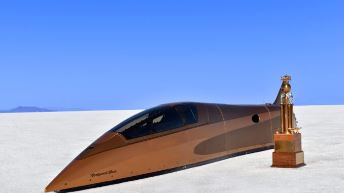 A Chevrolet-powered streamliner set a new piston-powered land speed record at the Bonneville Salt Flats in Utah.
