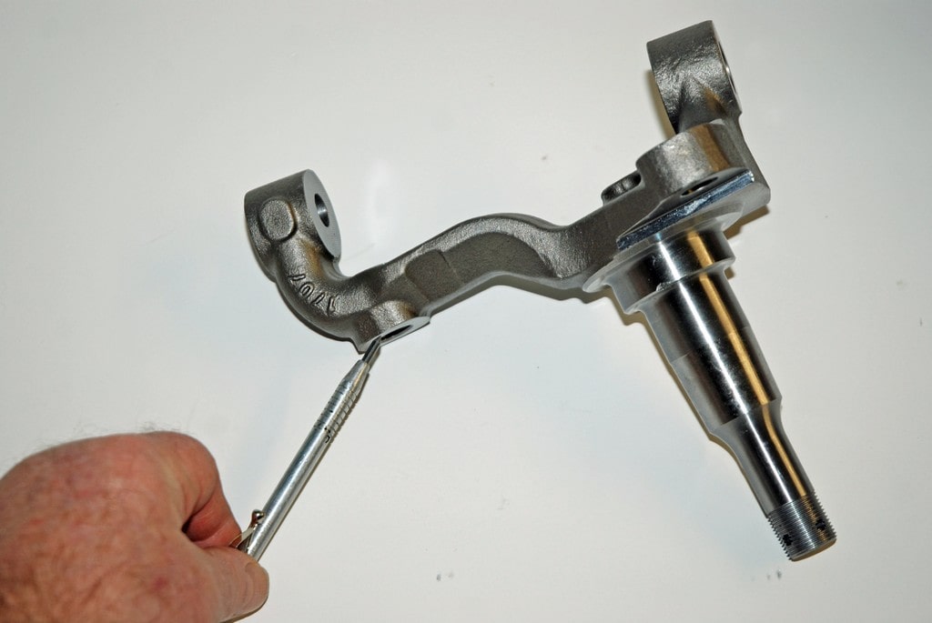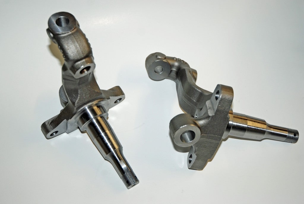 Disc brake spindles differ from drum brake spindles. The top boss that holds the drum brake anchor pin is taller than a disc brake spindle by anywhere from approximately 0.480-inch to 0.610-inch, depending upon the vehicle (or whom you source for info). While it is possible to machine a drum brake spindle to fit, the kit from Heartbeat City includes a pair of high quality reproduction spindles. These forged steel spindles are exact duplicates of GM part number 3961151 and they too fit a wide range of F body, X body and A body applications. They will work with stock GM drum brake steering arms.
