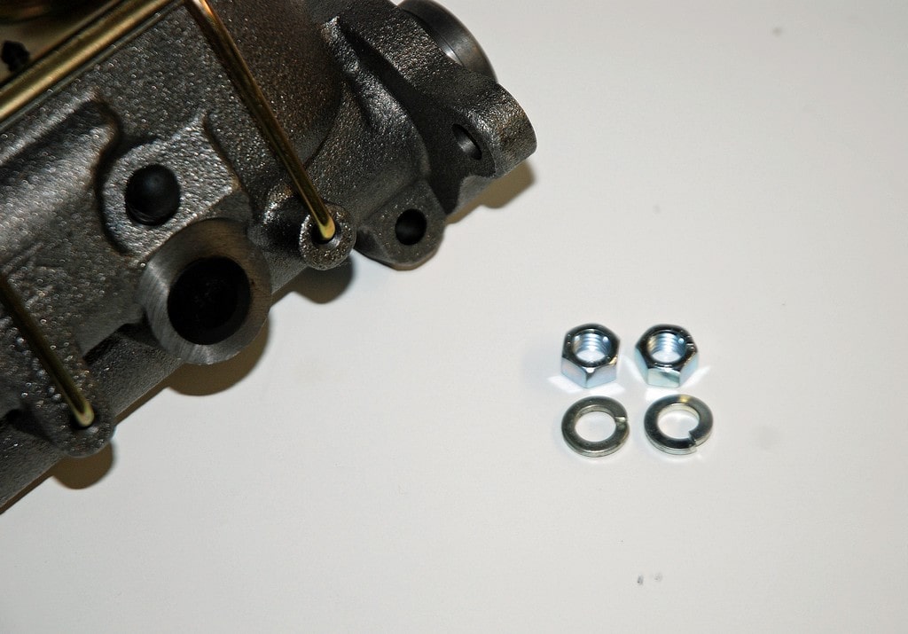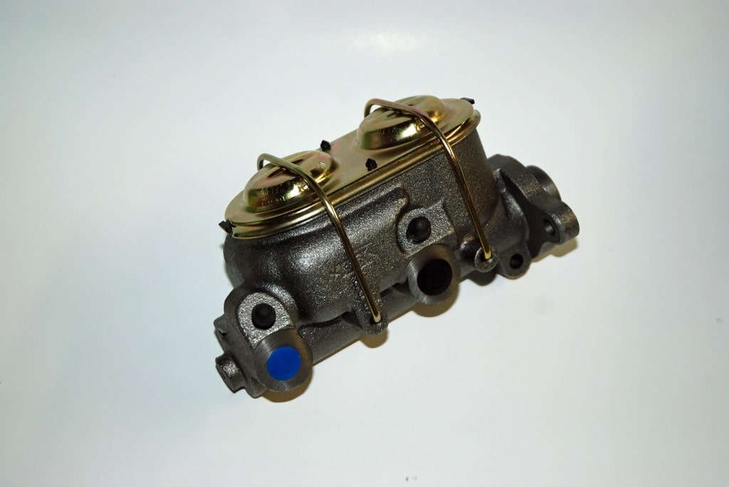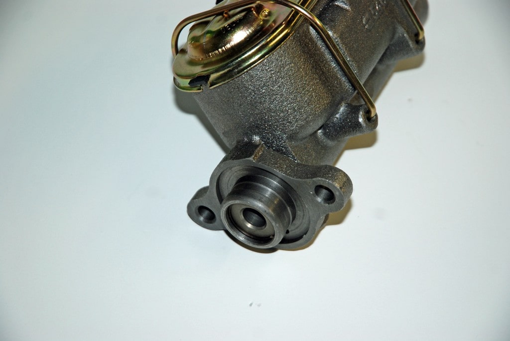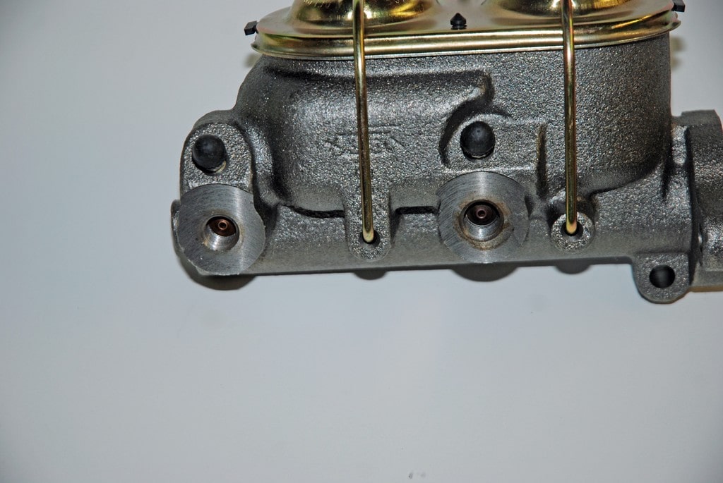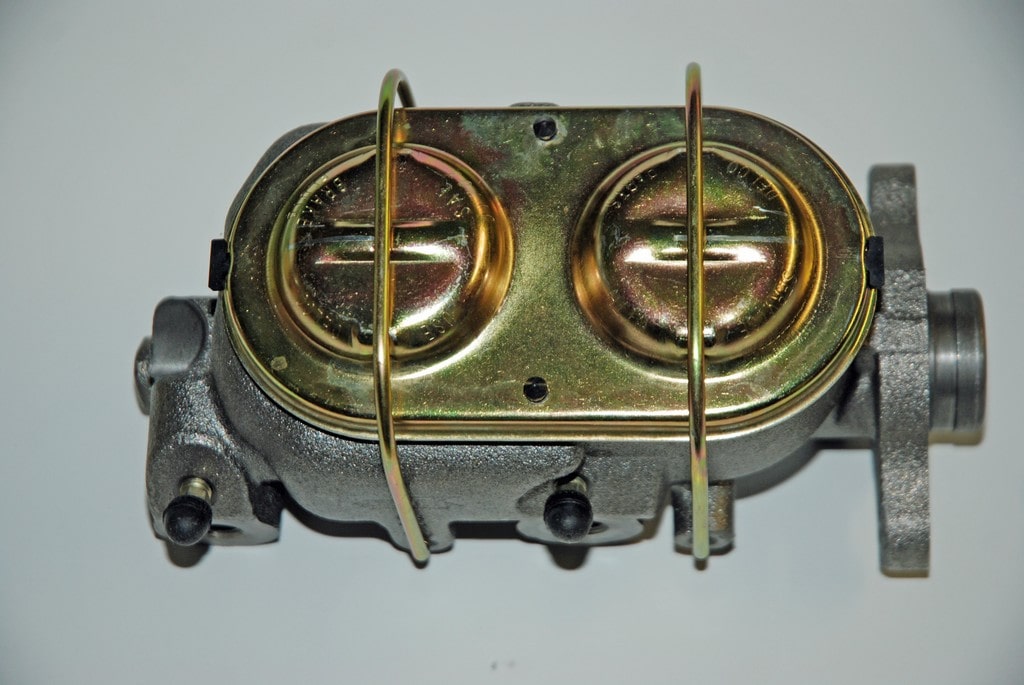 The dual reservoir master cylinder is a reproduction GM disc brake job complete with dual bleeders, a gold zinc plated lid (correctly plated, by the way, for the matching numbers set), lid “cup” seal and dual bail wires along with mounting hardware. The master cylinder (available separately from Heartbeat City under part number BRK-1352) fits a large number of GM applications from 1967 and up (typically up to 1977). It replaces GM production line part number 5460309 with the casting number on the master cylinder body. Bore size of the cast iron master cylinder is 1.125-inch. There are no built-in residual valves. The master cylinder mount holes measure 3.375 inches on center while the pushrod hole is 1.75 inches deep (not counting the flange step). With this setup, the master bolts directly to the firewall and depending upon the car, you can use your manual drum brake pushrod. The front port has ½-inch X 20 threads; the rear port has 9/16-inch X 18 threads. In terms of overall size, this master cylinder is approximately 8 inches long by 4.25 inches wide by 5.25 inches tall. It’s compatible with DOT 3, 4 or 5 fluids. Hardware to mount the master cylinder to the firewall bracket studs is included. GM specifies a torque of 24 foot-pounds for the nuts.