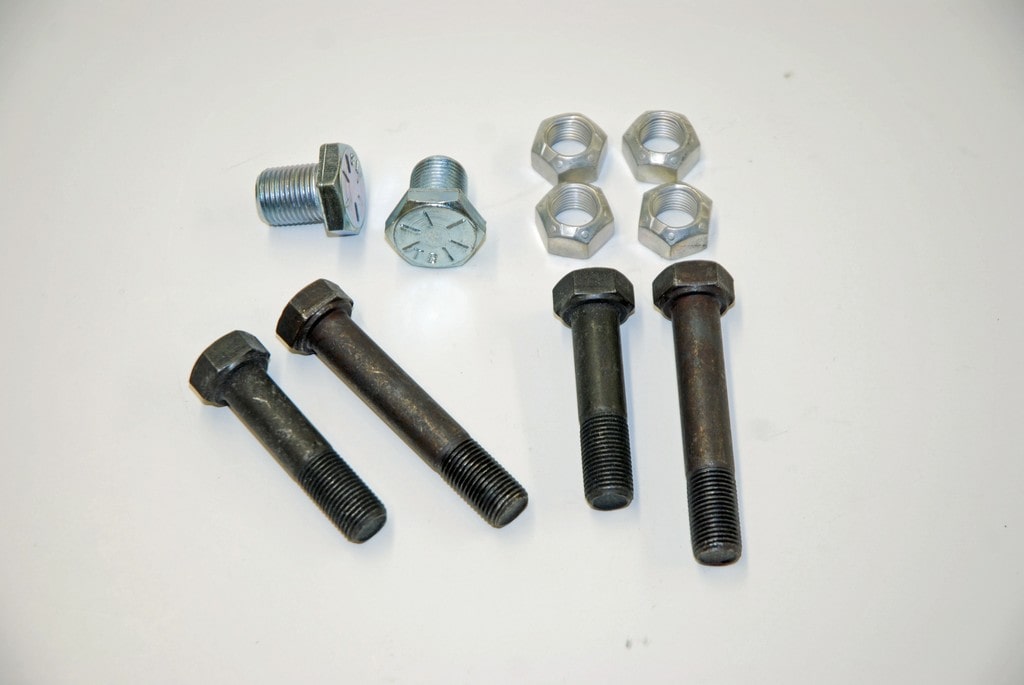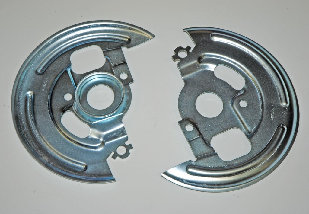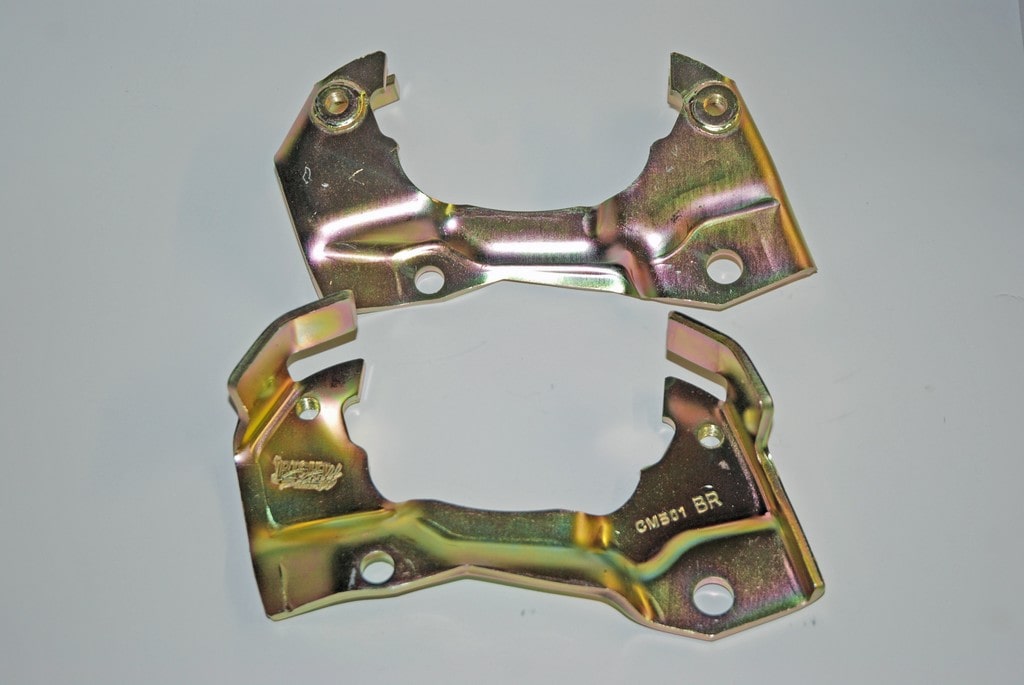 The brake caliper mount brackets included in the kit are heavy-duty steel pieces that are yellow (gold) zinc dichromate plated. There is a right and a left hand bracket, and both are exact reproductions of the original GM components. The ½-inch caliper bracket mount bolts (included in the kit) should be torqued to 75 foot-pounds. The silver zinc plated dust/water shields included with the kit are also identical to the stock production line parts. GM used a specific dust and water shield on disc brake applications. If you find a used set, you’ll find they’re often mangled from (of all things) the use of a large pickle fork and hammer to loosen ball joints. Mount hardware for the calipers brackets and dust shields are included with the Heartbeat City kit. And as mentioned previously, the (often missing) dust shield gaskets are also included.
