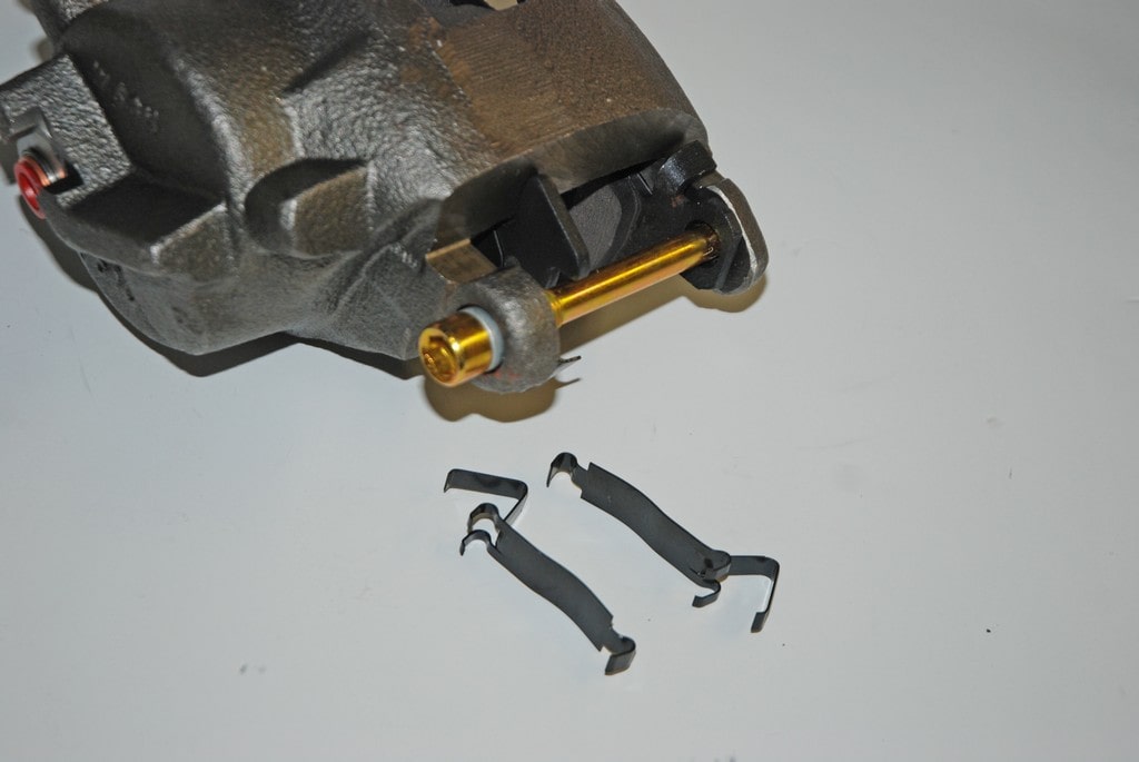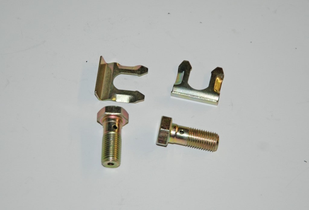 Another pair of items included in the kit is the brake hoses. Here, Heartbeat City supplies new SAE, DOT-approved rubber hoses complete with a banjo style fitting on the caliper side. New banjo bolts and fresh copper crush washers are included, along with four brake line retaining clips. Note that crush washers should not be reused – they were always designed to be replaced when serviced. Banjo bolt torque is 18-25 foot-pounds, according to a GM Assembly Manual (now you know why brake hoses are often hard to crack open).