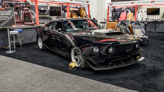 The Mustang was on display in the TIM Products booth at SEMA, and featured a custom interior with TMI’s all-new high-back seating, which is both comfortable and sleekly modern. Custom AutoMeter gauges, German square-weave carpeting, handcrafted door panels and a bespoke center console are other interior highlights.