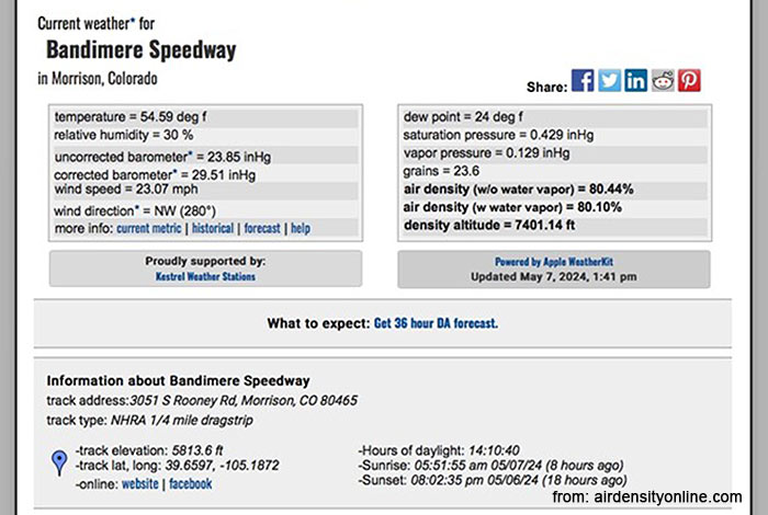 An extensive weather data summary from the website is shown here for motorsports tuning. That includes the altitude of 5,814 feet, quite ‘high in the sky’. Air density, as a result, is lower. A value of 80% is shown for this moderate May afternoon weather. For hotter, summer days, air density would be down in the 70% range. That is relatively low and presents a tuning challenge for racers who may compete at other racing facilities. Many of those facilities are at lower altitudes with higher air density, often over 90%. Tuning for both low and high altitudes is a challenge. Air density differences reflect a corresponding difference in power and fuel system adjustment needs. Performance effects occur because of nitrogen from the air. That would be amplified corresponding to air density changes.