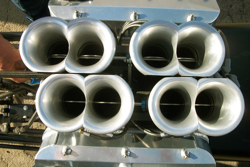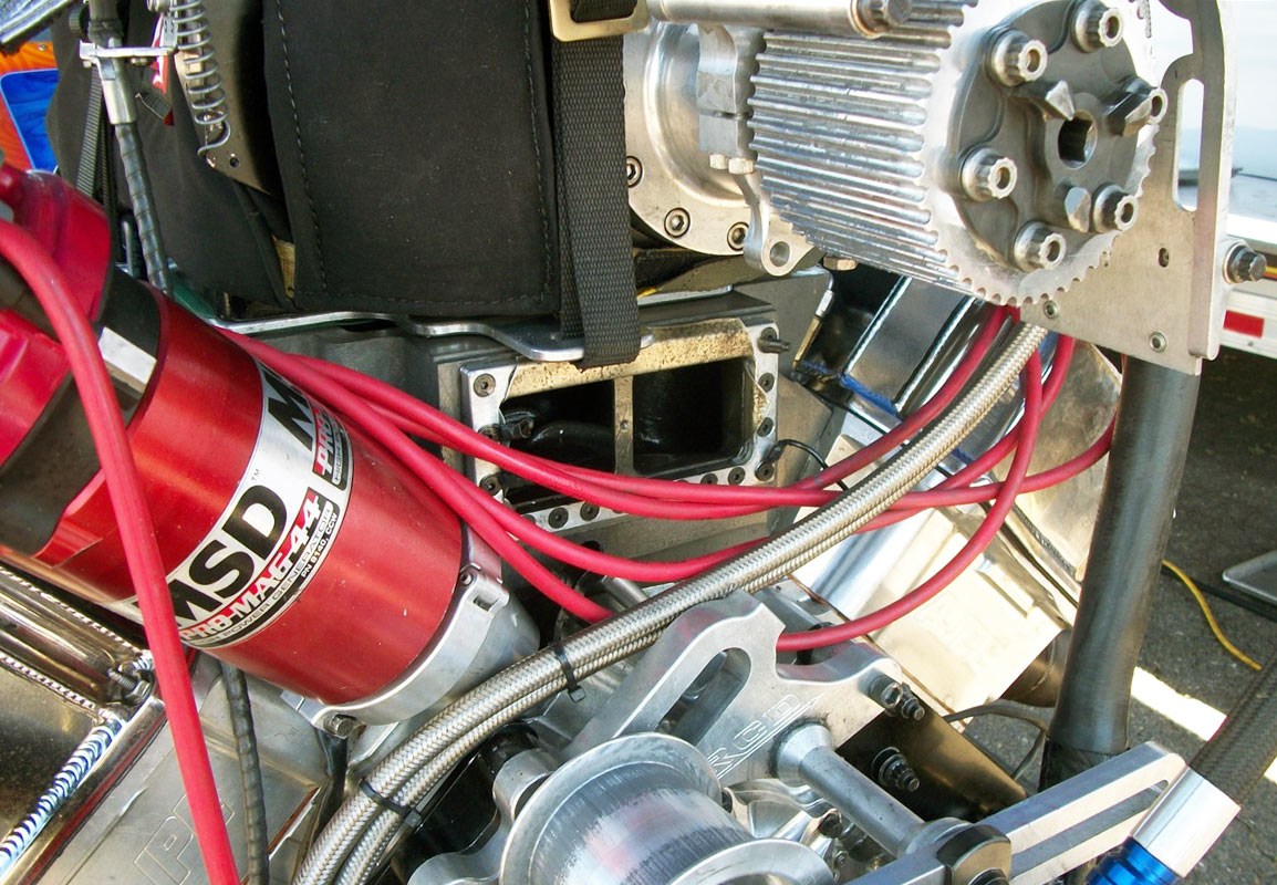 In addition, Nostalgia Nitro Blown Top Fuel engines most often are set up with relatively low static compression, typically 6 to 1. That combines with blower boost to make ‘running compression ratios’ over 14 to 1. With air/fuel ratio enrichment, that is about as high as possible to avoid pre-ignition/detonation with the amount of nitro fuel that the engine runs on.