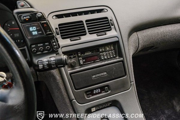 Inside, the charcoal leather bucket seats provide a comfortable and supportive ride, and they appear almost new, complementing the car's well-preserved interior. The factory-installed Bose AM/FM/cassette system brings music to your fingertips, while the charcoal carpets and door panels maintain the classic vibe. The center console and dash, also in great shape, seamlessly blend functionality with style, making every drive a pleasure. The car's interior is further enhanced by the ice-cold air conditioning, ensuring a comfortable environment regardless of the weather.