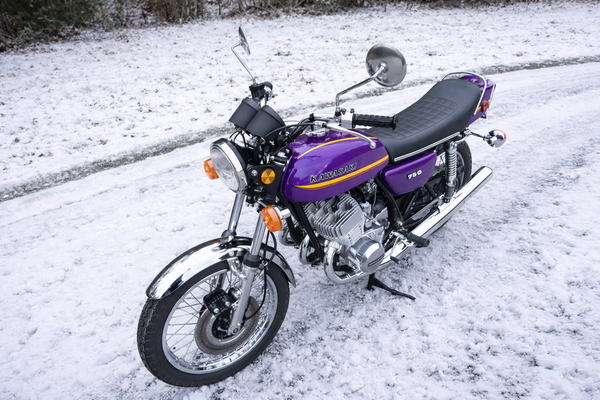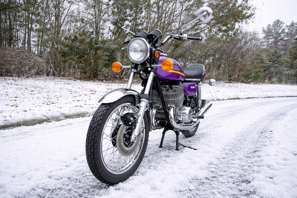 1973 Kawasaki H2 Mach IV an iconic two-stroke legend finished in striking purple with yellow and red accents. Powered by a ferocious 748cc two-stroke triple paired with a five-speed transmission, this H2 delivers the raw performance and sound these bikes are famous for.