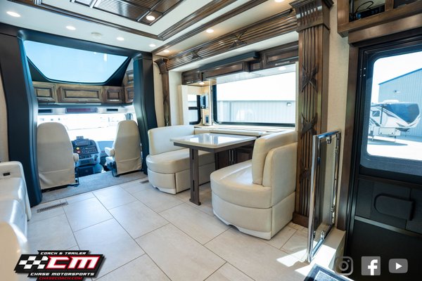 You will love the accent lights in the feature ceiling, the electric radiant heat under the tile flooring, the beautiful decor and the Villa furniture plus the spacious interior with a full-wall slide and two more slides. The side 92" hide-a-bed sofa with two ottomans, the dinette with four chairs and the two captain's chairs offer plenty of seating to entertain indoors or you can relax outside under the two side awnings. The cook can use the convection microwave and induction cooktop to make a snack or meal for all, and the 50" 4K LED TV on a televator allows you to watch the big game together. The full bathroom gives you a shower with a seat and storage for your linens and toiletries. The rear bedroom provides privacy and a good night's rest on your own king plush pillow top mattress with a bed top lift to watch the Samsung LED TV with Sony Blu-Ray disc player or read a book. This already amazing coach also gives you options to add features for your specific needs such as dishwasher drawer, different interior decor or cabinet colors, and/or a Sleep Number R5 radius corner air mattress, plus more!
