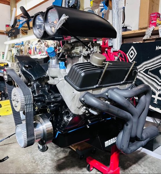 Includes: Moroso pan, shotgun air cleaner, engine stand.